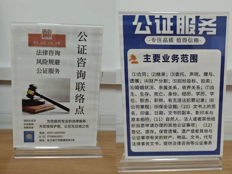 长汀县公证处以“一窗办、一站办、简化办、马上办”为抓手,积极推动公证领域“放管服”改革工程,先后出台《“高效办成一件事”公证事项(事务)清单(2024年版)》《长汀县涉企公证法律服务清单(2025年版)》《长汀县公证处便民服务措施》等制度,开设服务专窗和急证通道,推出“容缺受理”“全流程网上办““告知+承诺”等服务,最大限度缩短群众办事时间。在18个公共法律服务工作站设立公证咨询联络点,推行“公证服务长假不打烊”、上门服务、延时服务、预约服务等,真正把服务送到群众身边。