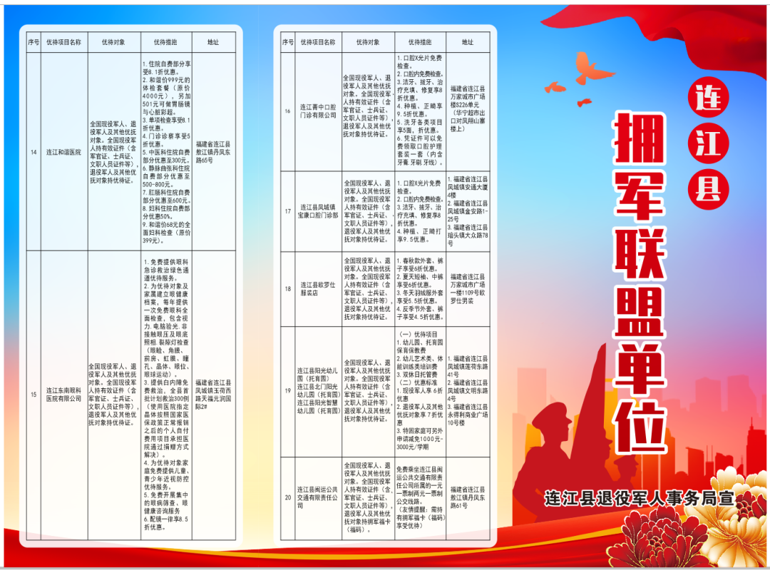 连江素有“拥军优属、拥政爱民”的光荣传统,双拥根基深厚、传统绵长,已蝉联2次“全国双拥模范县”、7次“省级双拥模范县”的荣誉称号。“下一步,我们将继续扩充‘拥军大联盟’的体量,在医疗、教育、文旅等现有合作领域基础上,进一步拓展拥军优属工作的深度与广度。”连江县退役军人事务局相关负责人表示,他们还将积极开展形式多样、内容丰富的拥军优属活动,为退役军人及其他优抚对象提供更优质、更便捷、更暖心的服务,共同谱写连江县双拥工作新篇章。