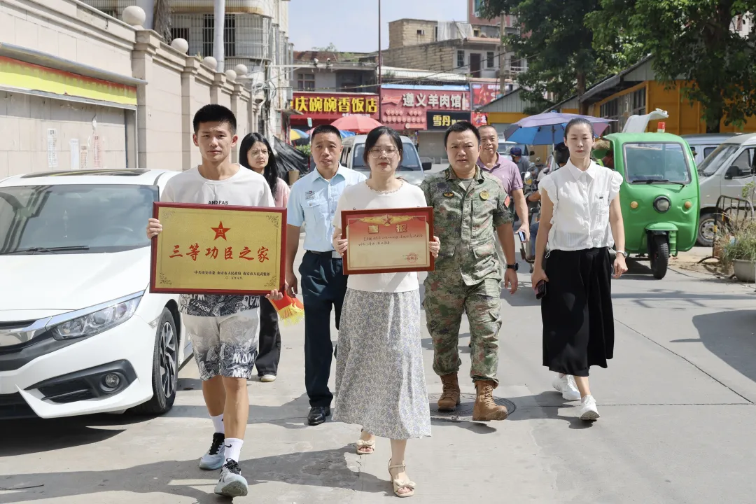 近日,莆田市秀屿区退役军人事务局、区人武部联合埭头镇村工作人员组成慰问组,为荣立三等功的现役军人林晨晟家庭送去立功喜报,共同庆祝这一荣耀时刻。