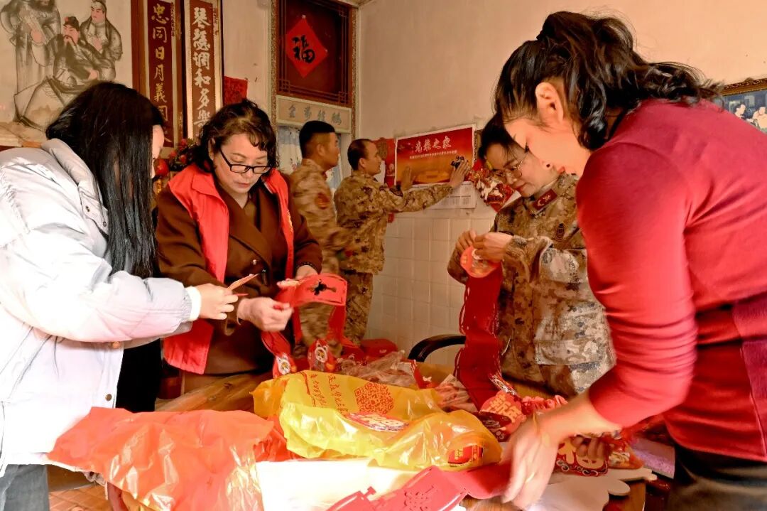 走访人员一进门,便纷纷行动起来:有的悬挂“我陪军属过大年”横幅,有的更换破旧“光荣之家”牌匾,有的张贴红彤彤的福字与春联,院中还挂起了象征团圆的小红灯笼。没多久,小院被点缀得喜气盈盈。