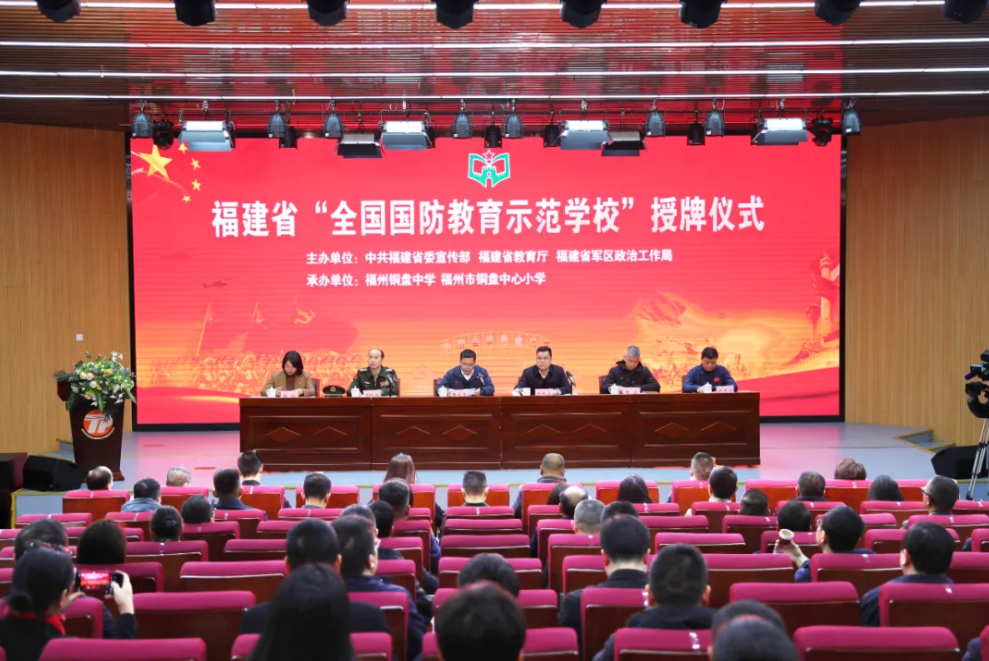3月31日下午,中共福建省委宣传部、省教育厅、省军区政治工作局在福州铜盘中学联合举行“全国国防教育示范学校”授牌仪式。省委宣传部、省教育厅、省军区政治工作局、省退役军人事务厅、共青团省委、省爱国拥军促进会等军地部门领导出席仪式,并向68所中小学颁发牌匾。
