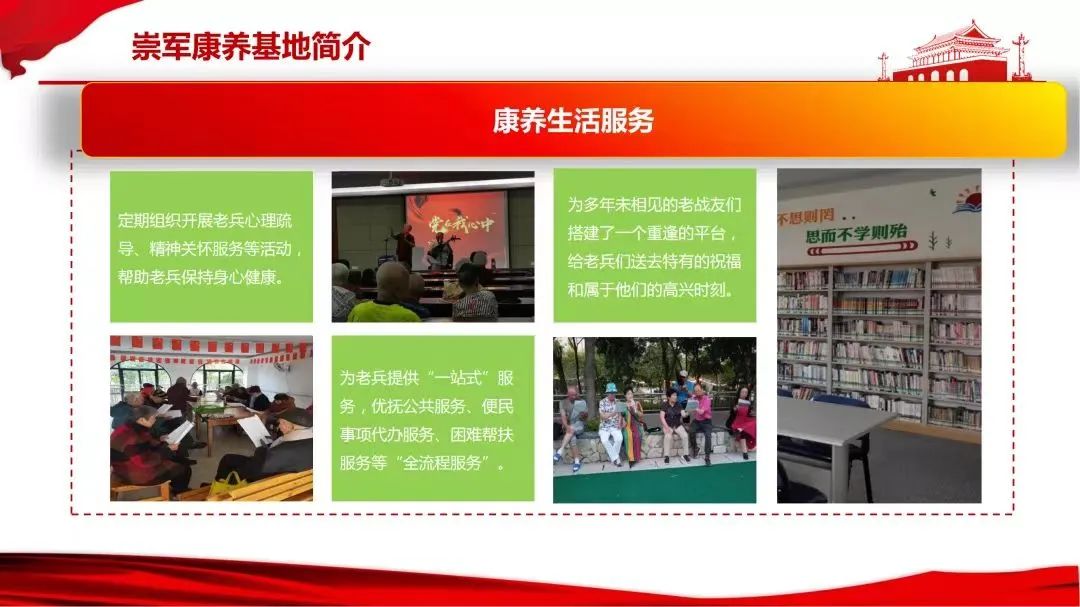 崇军楼里,随处可见张贴崇军拥军标语、国防教育宣传图片,以及摆放定制红军怀旧的日常生活用品,就连读书角也选取适合退役军人的书籍刊物,立足让来园区康养的退役军人老有“优”养。江南老年颐乐园负责人曾艳红介绍,接下来还将打造以“休”为康养主题的康养活动,包括唱红歌、看红色电影,还将举办茶话会,为入住的退役军人建立个人健康档案、定期组织健康体检,开展健康知识讲座等。