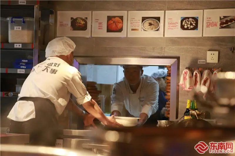 配菜之余,林联炳将做好的菜端至传菜口,熟悉后厨业务