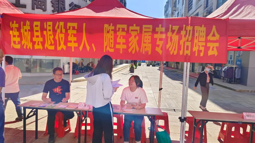 招聘会活动现场,连城县退役军人事务局设置了退役军人政策咨询台,工作人员积极为退役军人及随军家属提供职业介绍、政策讲解、社会保障及培训等相关咨询,帮助有创业需求的人员进行相关优惠政策辅导及个性化服务。本次招聘会共15家企业参加,提供就业岗位107个,50余名退役军人、随军家属前来参加招聘活动。