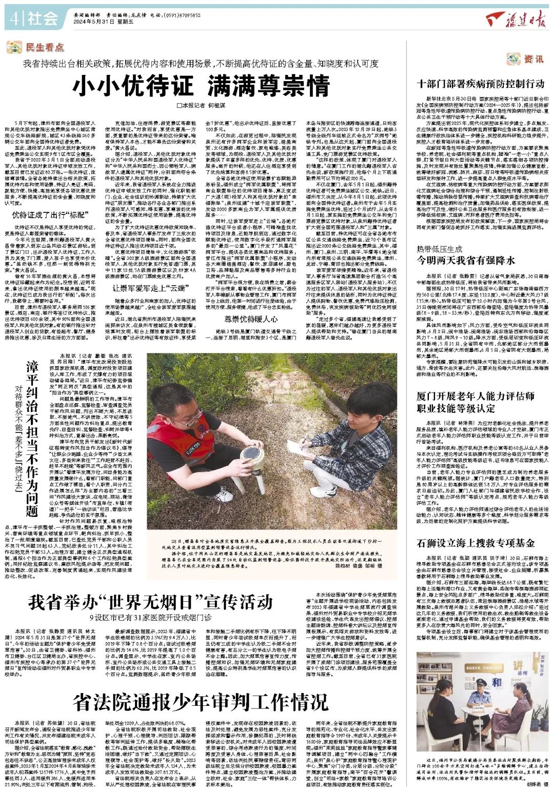 我省持续出台相关政策,拓展优待内容和使用场景,不断提高优待证的含金量、知晓度和认可度。5月下旬起,漳州市面向全国退役军人和其他优抚对象推出免费乘坐中心城区常规公交车线路新规,城区43条线路260多辆公交车面向全国持优待证者免费。