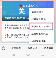 同时,龙岩市退役军人事务局还积极搭建“退役军人人才超市”,共有106家企业入驻,提供了2237个岗位,为退役军人求职就业提供更加有力、更加便捷的线上服务。关注“龙岩市退役军人事务局”微信公众号后即可直接使用。