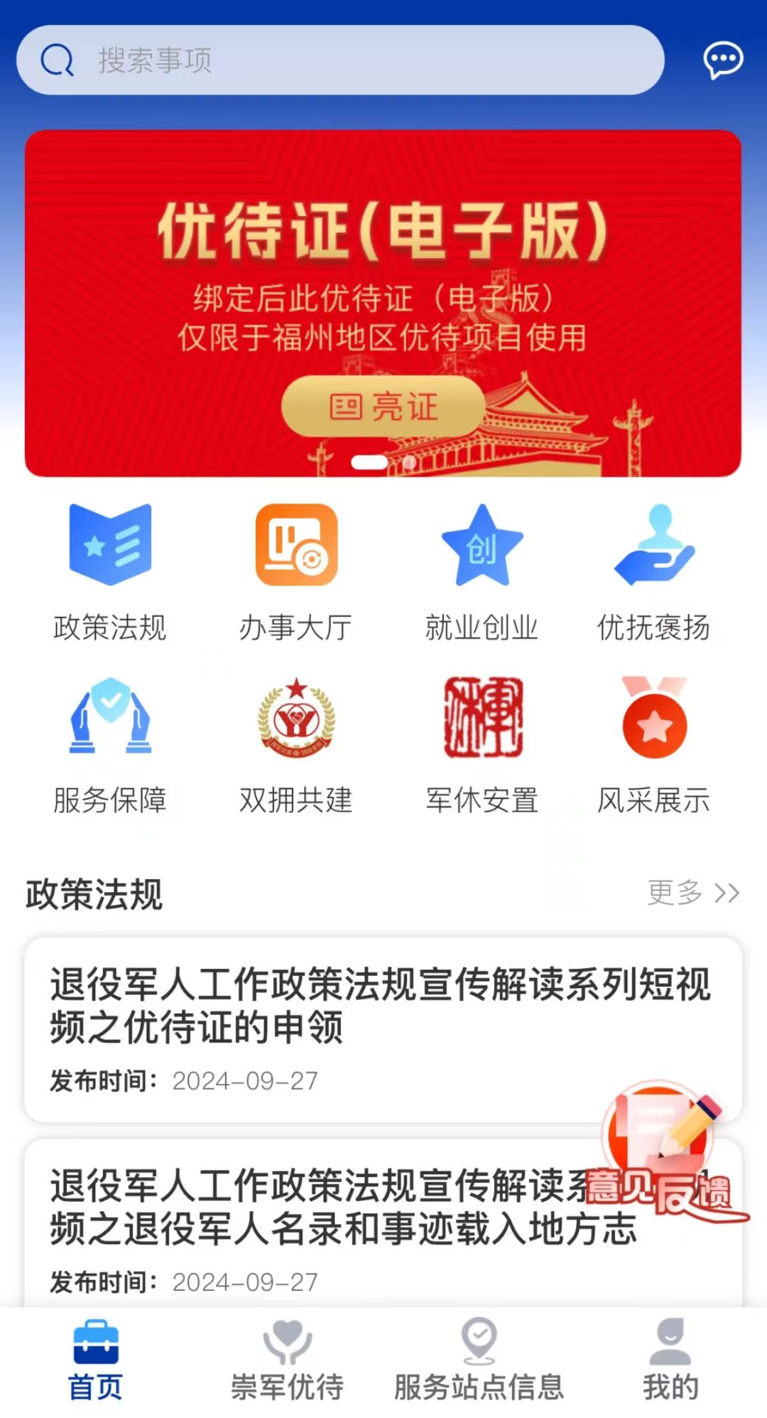3月7日,福州市在全省率先推出退役军人和其他优抚对象持证人的优待证(电子版)在“榕城老兵”一体化平台申领发放,标志着福州市“网上退役军人事务局”开始上线试运行。