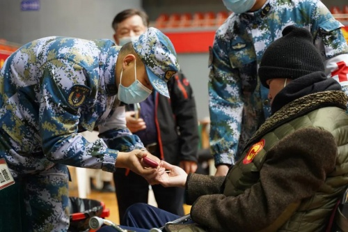 义诊活动现场还有两位因高血压而中风,坐轮椅的退役军人。几位战士和志愿者纷纷上前,帮助推轮椅、填写就诊信息,其他退役老兵纷纷主动让他们优先就诊、检查。这两位退役军人的亲属对服务团队表示感谢:“平时里他们行动不便,去一趟医院不容易,今天难得有省会专家来检查,服务也很周到。”