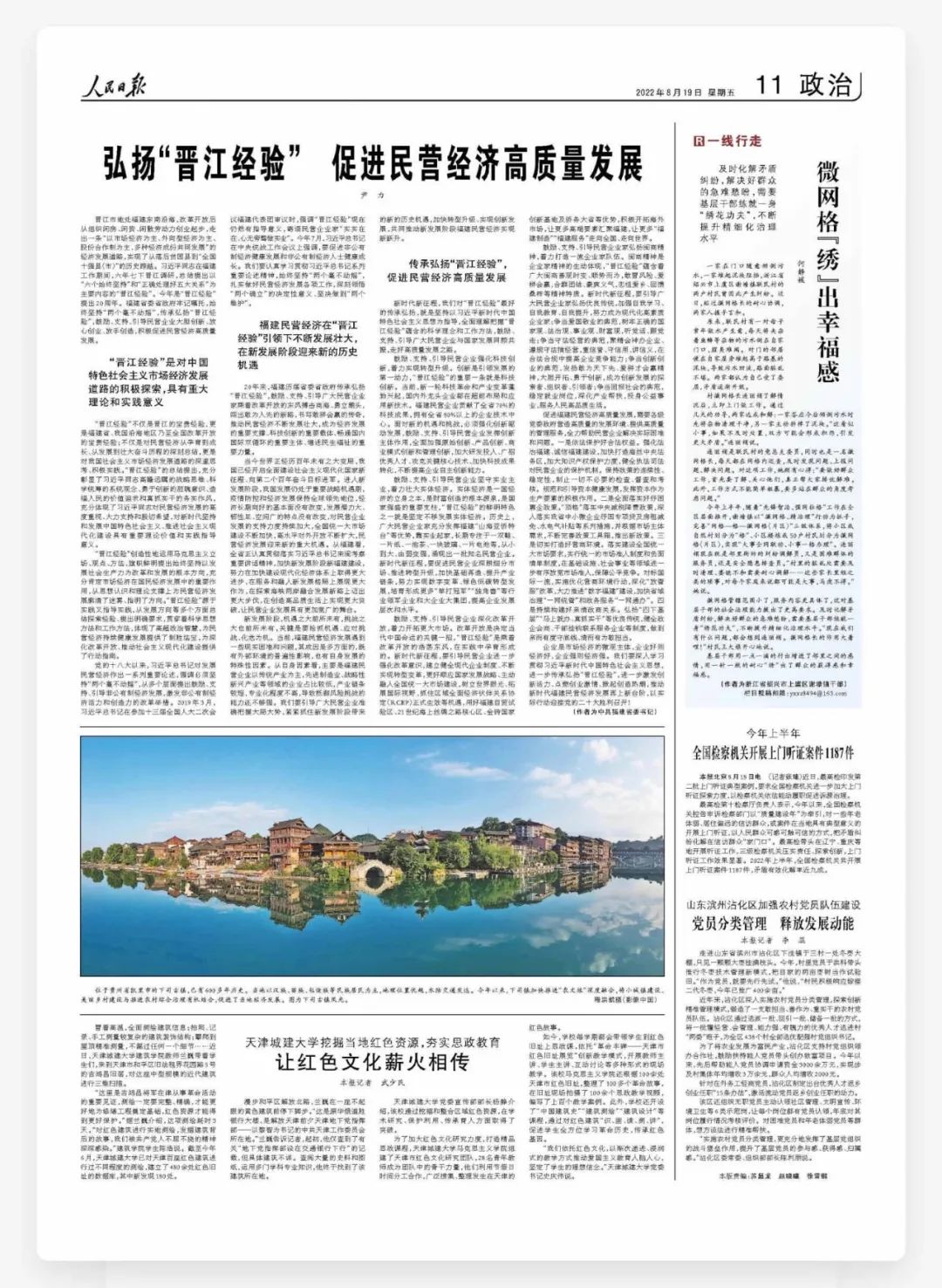 20年来,福建历届省委省政府传承弘扬“晋江经验”,鼓励、支持、引导广大民营企业家乘着改革开放的东风搏击商海、勇立潮头,闯出敢为人先的新路,书写敢拼会赢的传奇,推动民营经济不断发展壮大,成为经济发展的重要支撑、科技创新的重要载体、畅通国内国际双循环的重要主体、增进民生福祉的重要力量。
