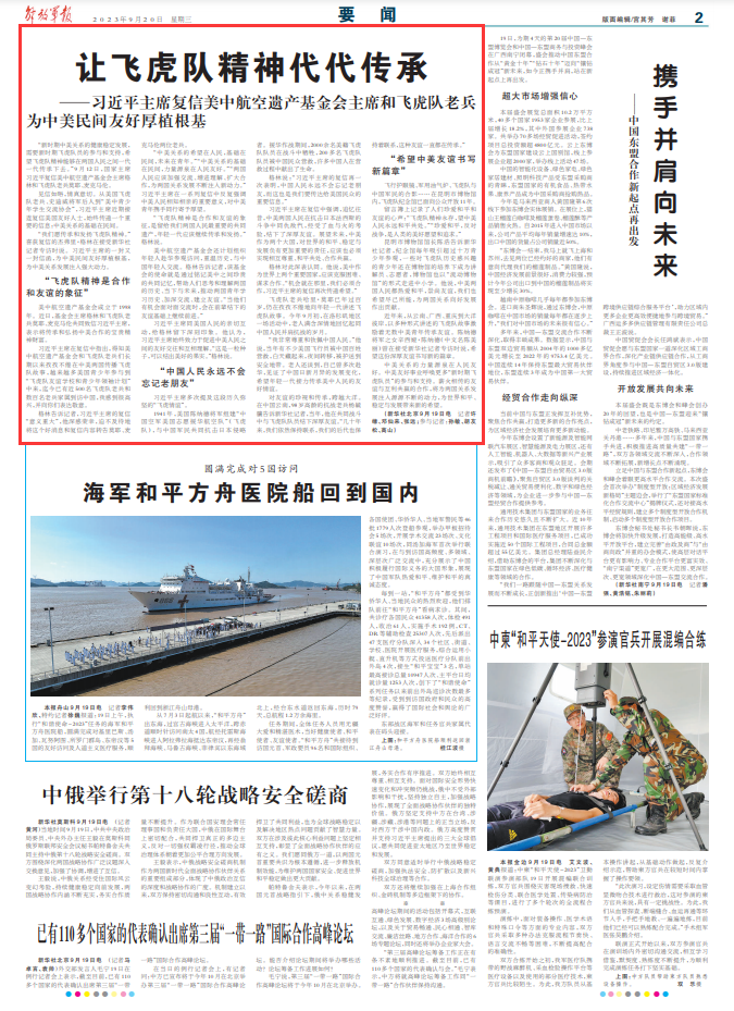 “新时期中美关系的健康稳定发展,需要新时期飞虎队员的参与和支持,希望飞虎队精神能够在两国人民之间一代一代传承下去。”9月12日,国家主席习近平复信美中航空遗产基金会主席格林和飞虎队老兵莫耶、麦克马伦。